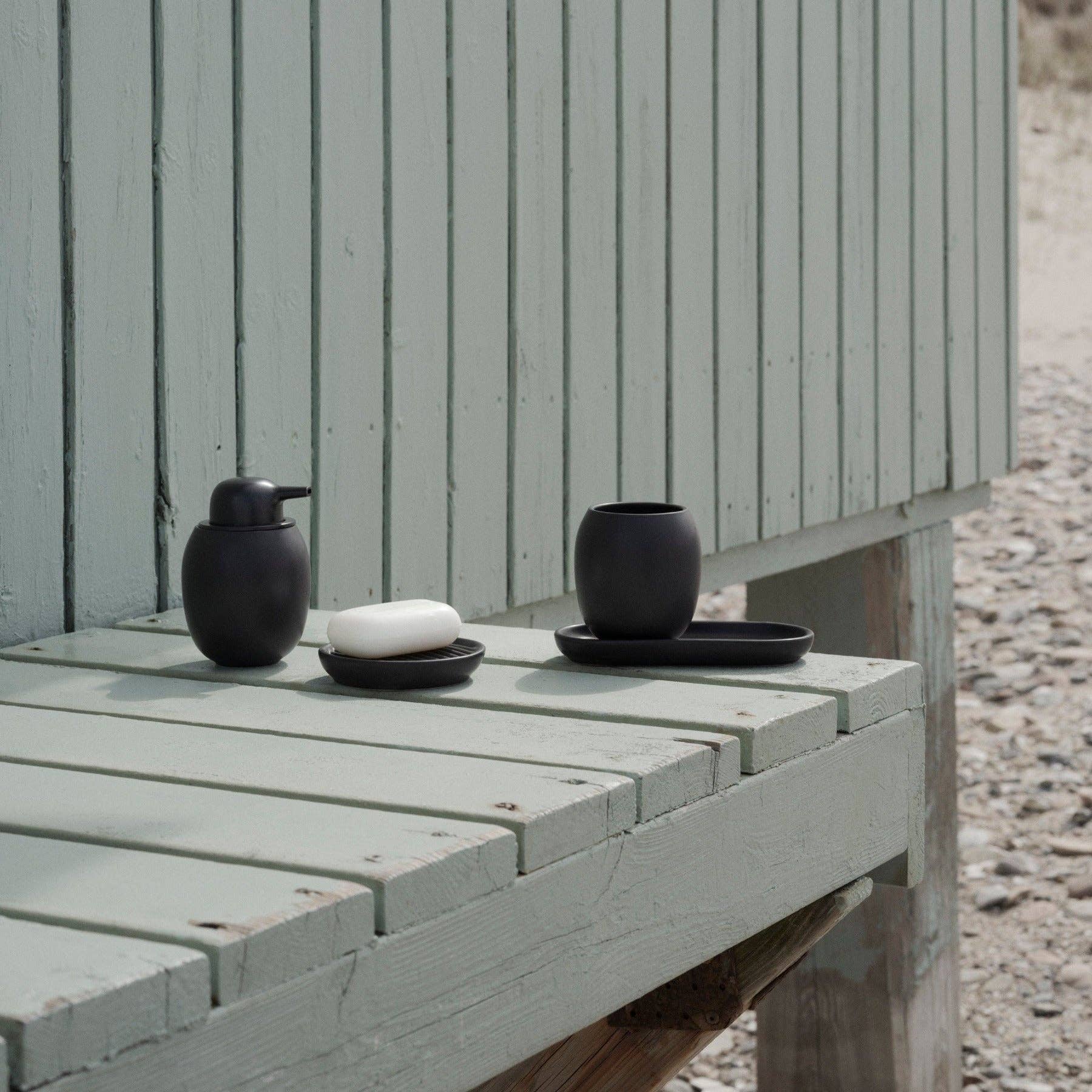 The hallmark of the Fjord bathroom range is its harmonious shapes, which will add a simple, organic, stylish touch to any bathroom or kitchen. The Fjord line comprises: a soap dispenser, a soap tray and a mug. You can use the mug by itself - for example, for makeup brushes - or combine it with the other items in the Fjord line. * Material: Stoneware with matte finish * Finish: Black * Designer: Debiasi & Sandri * Maintenance Clean with hot water and mild dish soap. Not dishwasher safe. * Use as toothbrush holder, make up brush holder or cup * Measurements: 3.42" Ø x 4.09" H SKU: 113