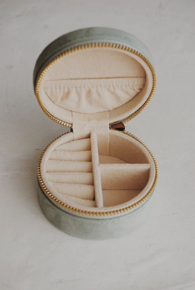 Circular jewelry box or travel case perfect for storing all of your treasures. This jewelry box can hold rings, earrings, necklaces and other precious pieces.